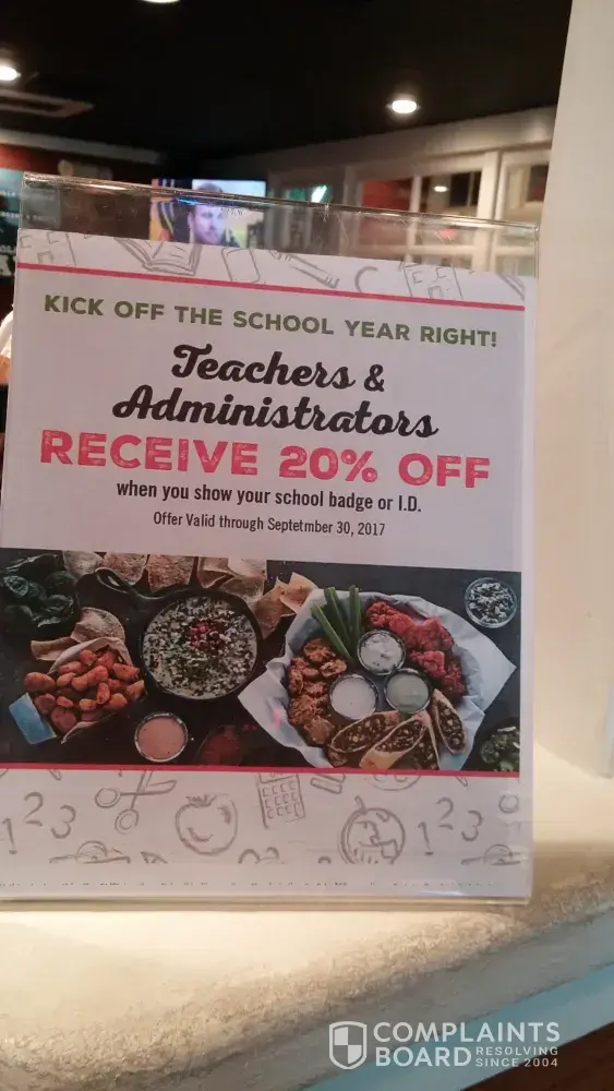 Then I said I’d like to speak with the manager. The manager came to the table and said that we would have to choose between promos. The 2/$22 is considered a promo and so is the teacher discount and said we couldn’t take advantage of 2 promos. I pointed out that the 2/$22 is on their menu every day and I didn’t think that was right. He said that is the way it is and we got up and left with him standing at our table.