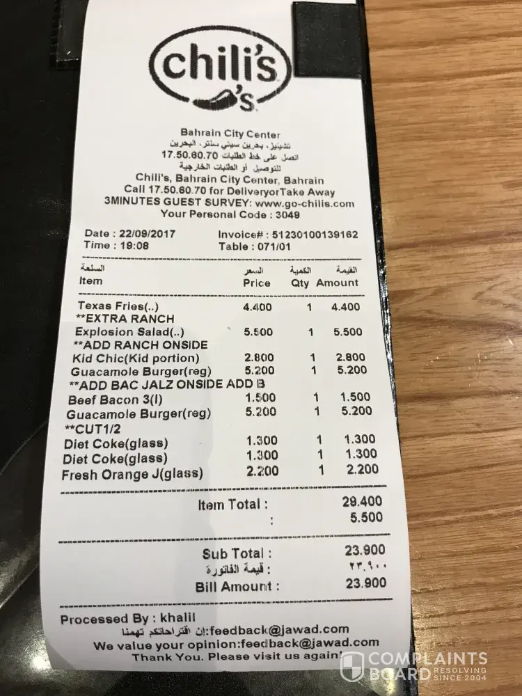 Just I want to inform you about the Chillis branch in Bahrain city center mall and Jufair area, the quality of food is so bad salads and sandwiches, size of the portion is so different than before and the test also is so bad the price everything is totally changed here in Chillis Bahrain, I have the pictures of the food how bad was the service