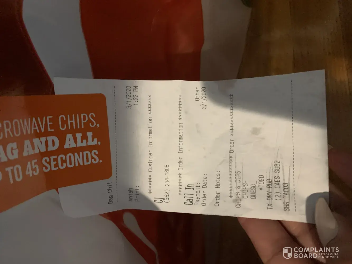 My Togo order ticket time was 30 minutes when I was told 15 minutes. The tacos were cold. The soft tortilla was so hard And I couldn't even bite into it or chew it. I didn't get the large BBQ or Large Caesar dressing I asked for. The Floor manager didn't seam to care about the long ticket times at the Togo station. I Didn't enjoy the food or my experience at all