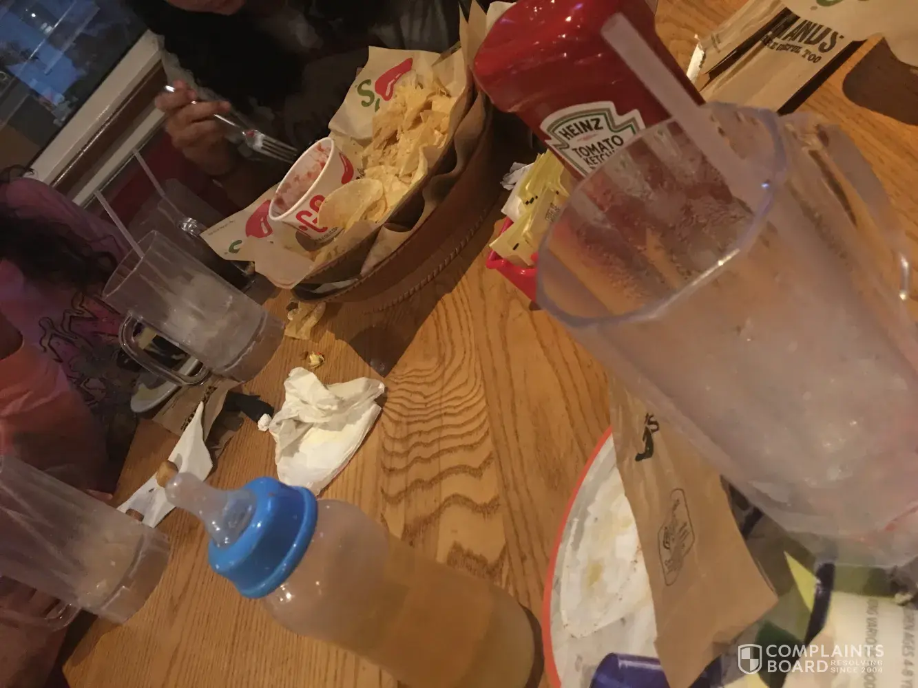Myself and my family were out to eat tonight at your Machesney Park location. This picture attached is the view I had as I sat to enjoy my meal. It was more annoying to see the manager and several team members walk right through the trash and leave it there. GUEST PERCEPTION should always be in your mind. This was my first time at this location and probably won't be back.