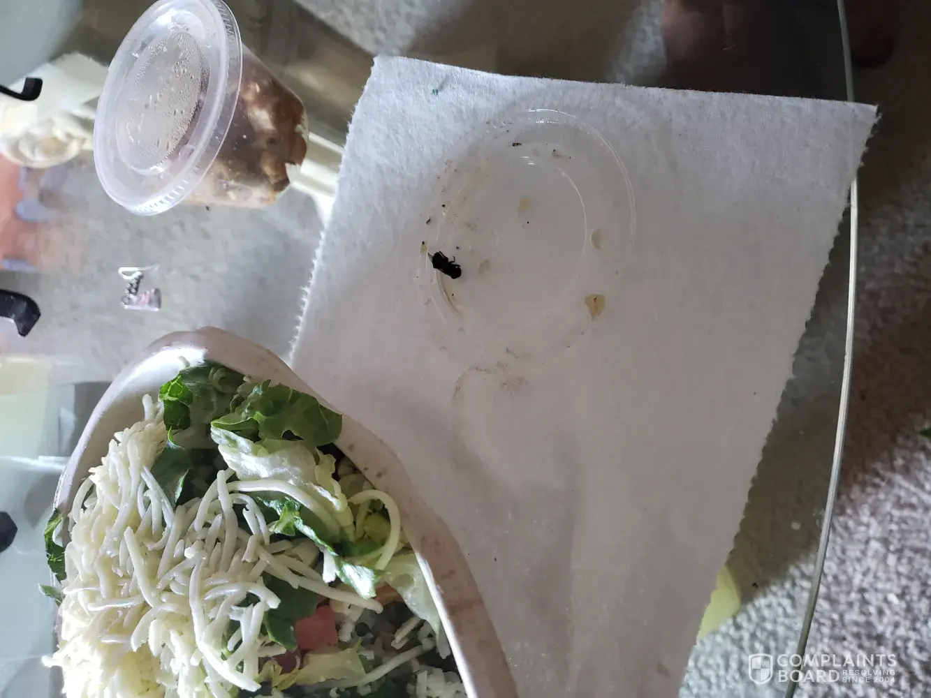 When I ordered a chicken-steak bowl to go in the restaurant and took home my food, I finished about a quarter of my food before I moved the lettuce to find a medium sized bug hidden underneath. I went back to chipotle and all I got was a replacement meal but I would have preferred to be compensated for the effort of taking useless time to refund my meal.