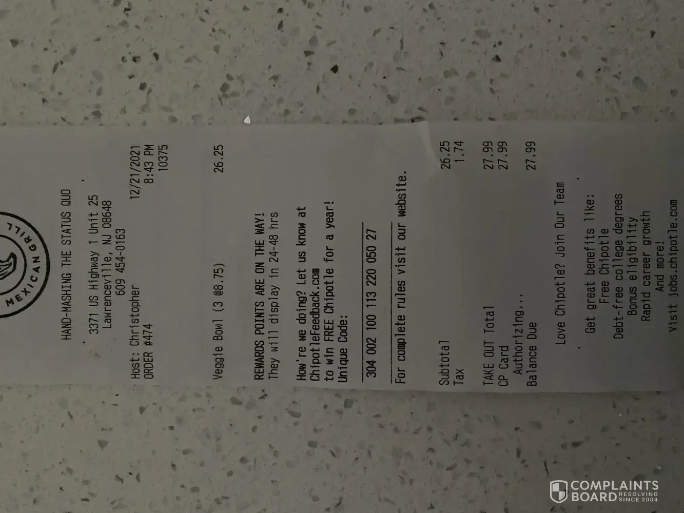 Yesterday I ordered 3 veggie bowls from the store here in New Jersey.I came back home after getting the bowls.when I ate that food it was totally worthless.rice was totally uncooked and I was feeling like I'm eating soaked rice .if it would have been 1or two spoon then it's ok but in all the three bowls the rice was totally uncooked.so threw all the bowls in the trash.It was 9.15 in the night.The time I went to store it's already closed.I tried to contact the customer service online they are saying they can't help me because I ordered in the store not online.what's this?whether I order online or from store I ordered from chipotle.they are giving me one free bowl with purchase of one.I don't want to waste my money again.yesterday my 26$ wasted for the worthless food which not at all eatable