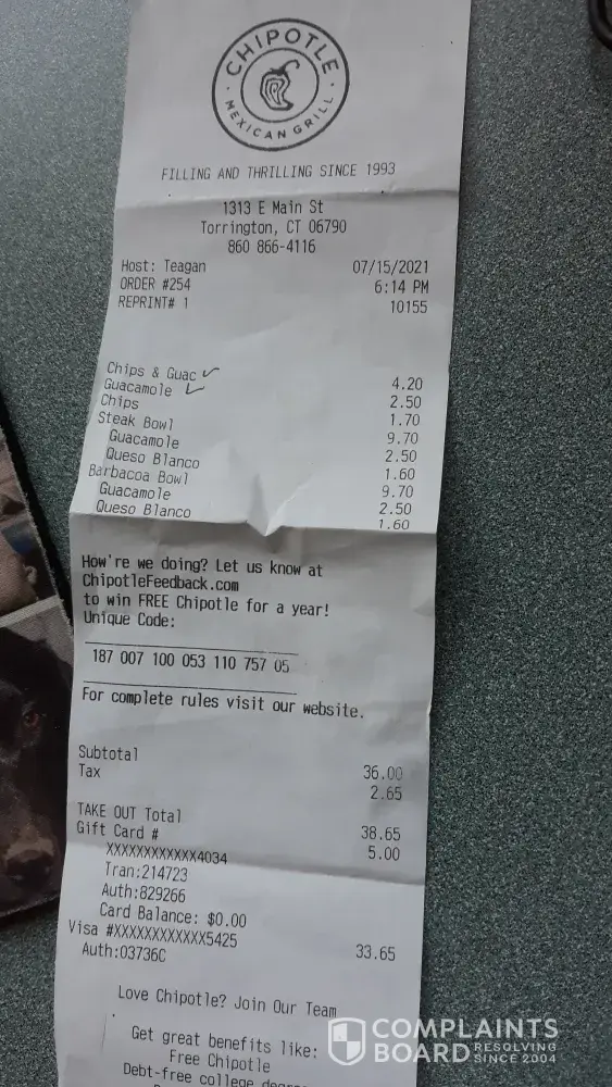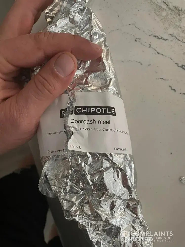 Read full complaintChipotle meal totally unsatisfactory: No Chicken, No plastic ware, No napkins, No Chips