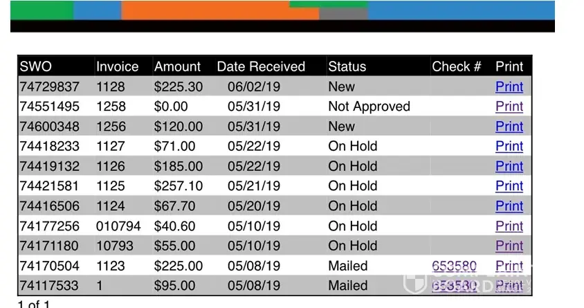 You guys can see the invoices down below. I received one check for $135 that was split for 2 invoices that were authorized for over $315 I'm not really interested in spending too much time convincing the world of their bad business practices but the list goes on.