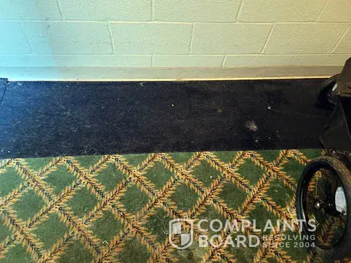 When I returned late Saturday evening, I noted that there was more pet food in the side foyer. I also noted pet hair. When I opened the door to the hallway, I was assaulted with the unmistakable smell of cat urine. Instantly, my throat and eyes began to swell. I had to take medication immediately. I walked through the hotel to the front desk. The desk agent was talking to two men who I assumed were maintenance workers. I complained about the cat issue and how I was assured there were no pets on site. All three employees stared at me blankly and said nothing. Again, the desk agent couldn’t be bothered to stand up to talk to me. The desk agent finally asked the men to check out the smell. I watched them as they walked down the hall and left the area. They had checked nothing. I asked that the floors get swept and that something should get sprayed to get rid of the smell. I went to my room as I thought it would be safe. Many floorboards were broken and tiles lifted up as I walked. As a disabled person, it is fortunate that I did not fall. The AC unit in my room was ineffective. I carry a fan when I travel so I was able to spray the entrance way and air out the room so I could sleep.