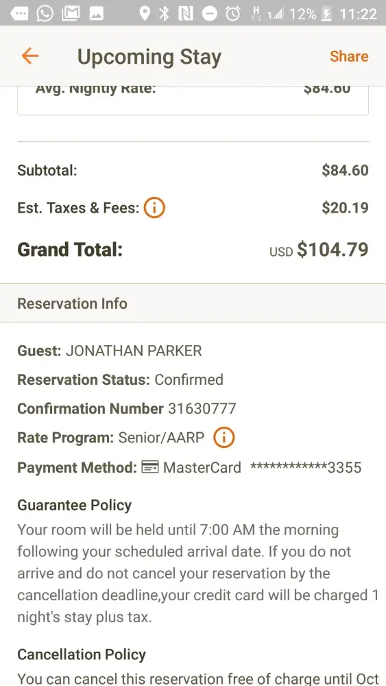 Stay date: Arrived October 5, 2018 for one night on confirmation # [protected] and arrived October 5, 2018, for one night stay and parking for 7 nights for confirmation #[protected].