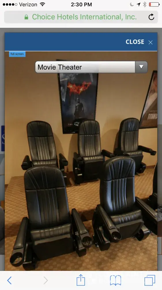 So that evening the teens went to the front desk to ask where the movie room was. The front desk person rudely told them that they haven't had that in 5 years. So I emailed choice hotels ... 3 weeks later the pic of the movie room is still on their website. False advertising, I also complained about the room as there must have been too much moisture as the sheets and blankets felt damp. Plus room wS barely cleaned each night and toilet wSnt cleaned the whole time we were there, this is why we don't stay st these type hotels. Over $1000 for 4 nights. Disgusting overall condition nit what I paid for st $250 a night