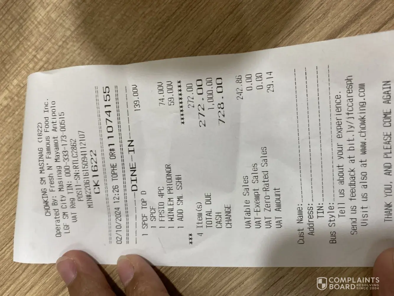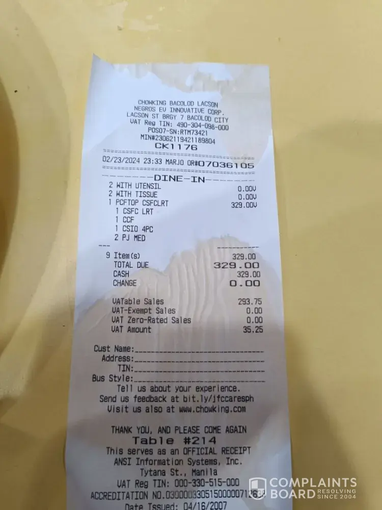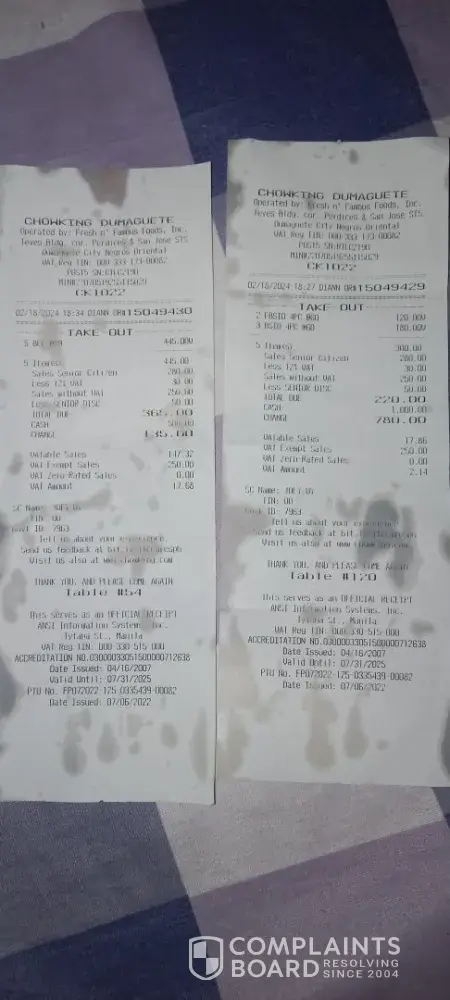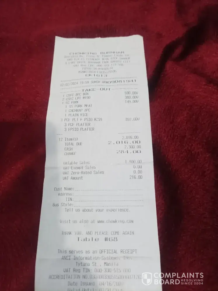 Read full complaintChowking complaints: history and resolution overview