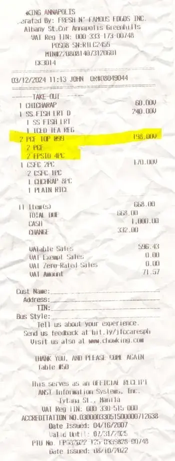 Hi customer service. We ask our messenger to purchase food at chowking Annapolis for lunch. Since it’s already pack he didn’t check it. When we were eating we realized there is something lacking in our food. When we checked the receipt we found out that it was the siomai. Next time double check the items before dispatching it. We pay for that and we only have 1 hour break to go back into your store for the missed out items. I attached here the receipt for your reference. I hope it won’t happen again. Thank