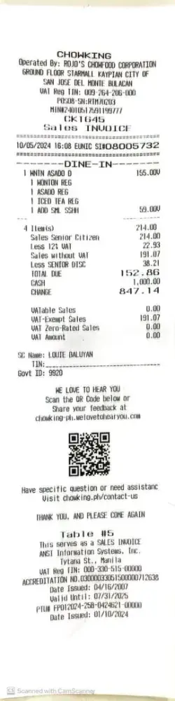 Sr. Citizen yung dad ko so sinulat ko sa paper in capital letters for easy reading na 3 Siomai Chao Fan (steamed beef) and 2 Siomai Chao Fan (fried beef). Yung tinake ng cashier is siomai lang. Naghintay ang dad ko ng matagal at siomai lang binigay. Nung mali yung order na binigay sa kanya, sinabi ng cashier na order naalng ulit xa ng beef chao fan. Per you website, Siomai Chao Fan is available at 107. But father ended up paying more dahil sa pagkakamali ng cashier. Are you abusing senior citizwns this way para makabayad sila ng mas mahal? Shame on you.