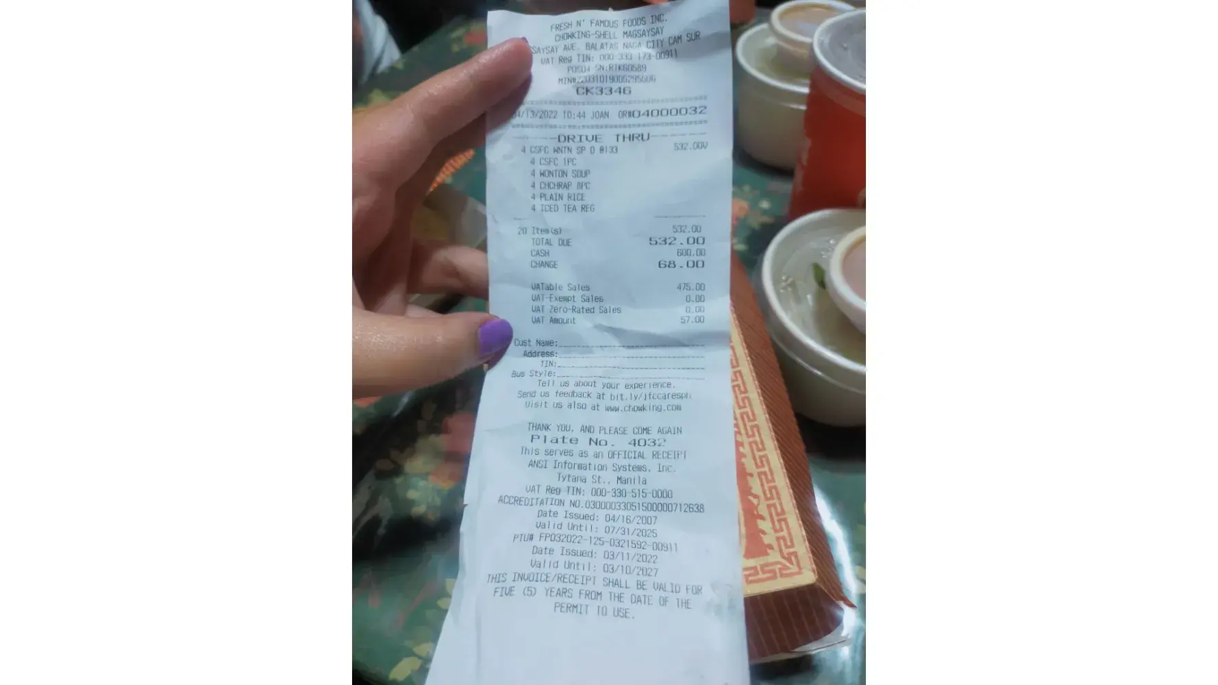 We ate at Chowking San Fernando Pampanga Branch near intersection area yesterday April 19, 2022 around 1:30pm (Not much customers)