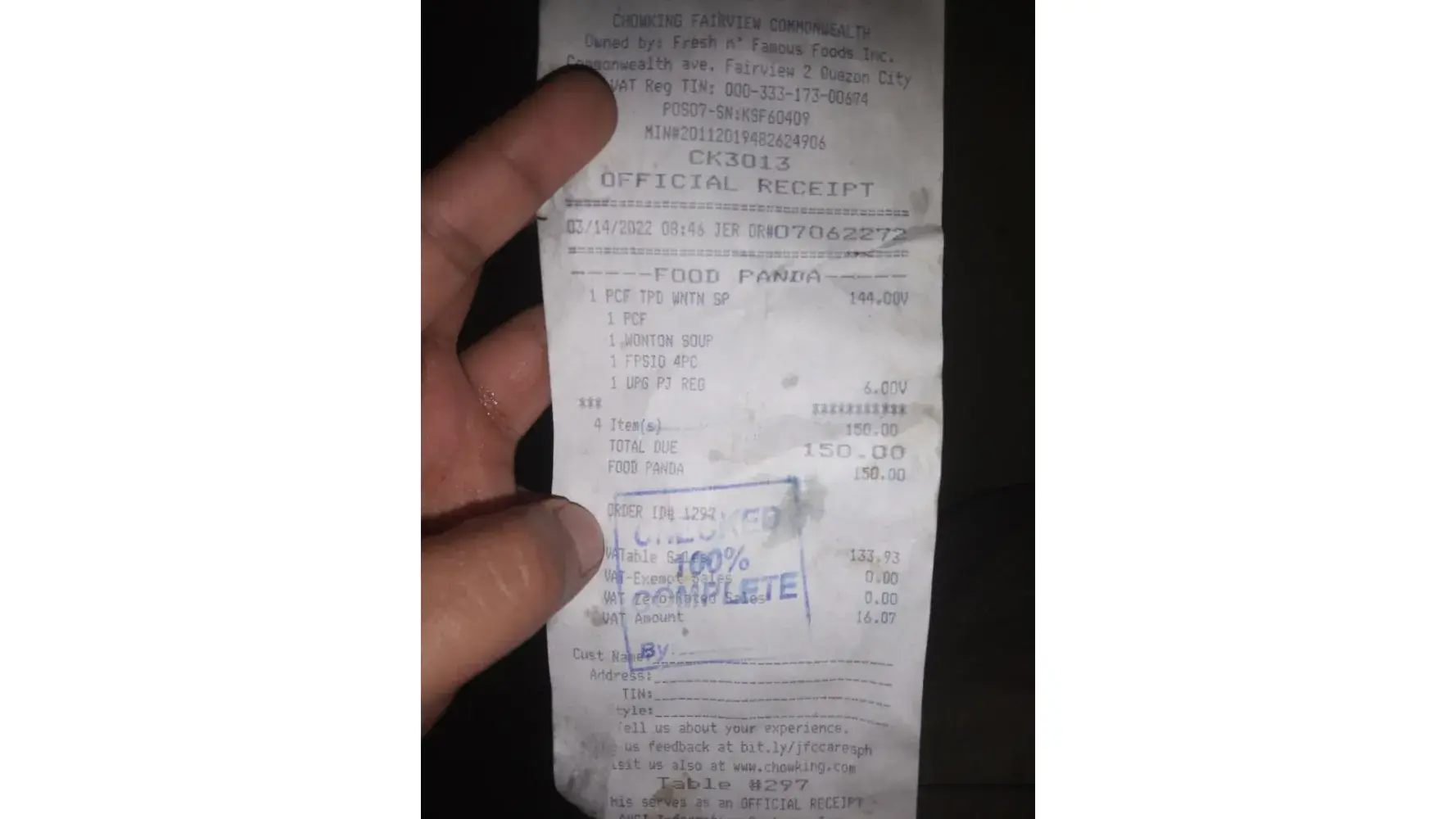 I went to chowking legarda march 6,2022 around 10:20pm and ordered salt and pepper spareribs pork chaopan steam siomai toppings and pork chaopan. And they served me a looks like fire salt and pepper spareribs and even the ingredients, I didnt check it beacuse it was for a take out order I ordered 3 meals but they gave me 2pairs of spoon and fork and also dont have a vinegar, the cashier was not accomodating. Im just wondering there arent many customer for my complain to happen.