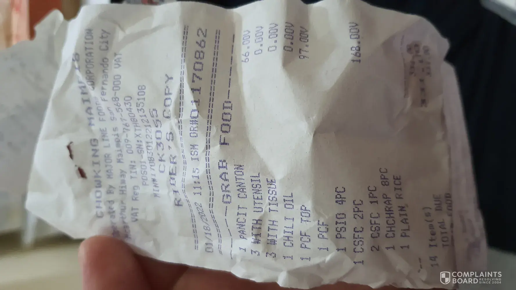 Today, february 23, 2022 at 11:37, I ordered (chaofan) and 1 box of chocopao, for takeout at chowking, sm bicutan, bldg a. When they call my number, I grab the product and left.