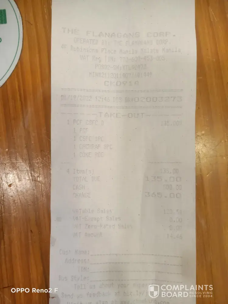 Good evening Chowking Gil Fernando Marikina, Bakit kulang yung binigay na order samin sa Drive thru? And yun receipt mamin ay wala pa samin kaya di kami makatawag sa store nyo Around 11pm tonight nagorder kami dyan sa drivethru -_- sobrang craving pa naman ako sa Chao pan with dumpling tapos wala pa yung Chicken lauriat hayst nakakainis nalang bumalik kasi from antipolo pa kami nagdrivethru nalang kami dyan dahil galing kami ng work.. Nakakadismaya kasi gutom kana tapos kulang pa pala yung order namin. Sana maideliver samin agad ito dahil tamad nadin yung asawa ko na bumalik sa store nyo at umuulan pa ngayon.