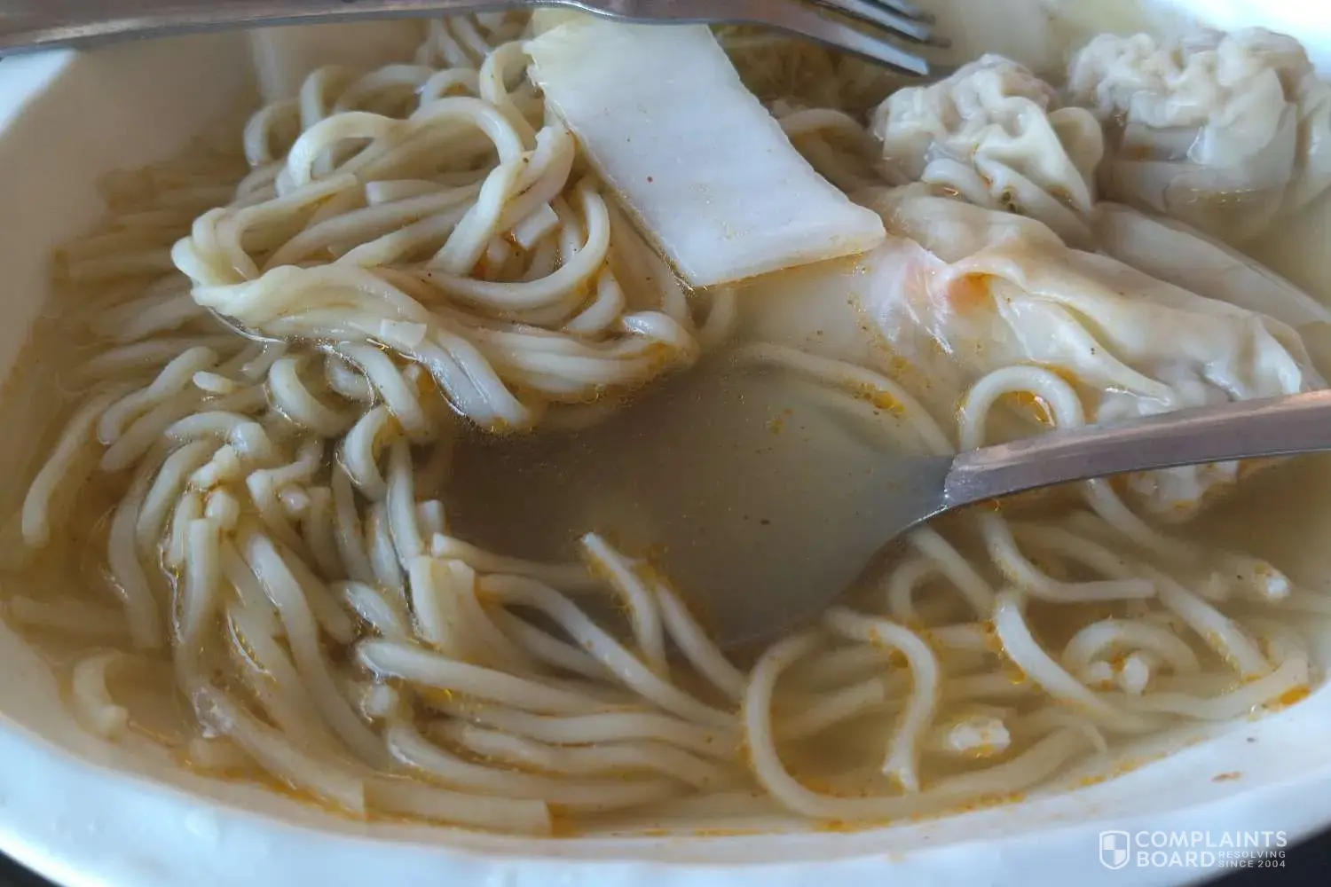It no onion spring and no garlic plain soup and a lot of noodles with a toppings of steam siomai