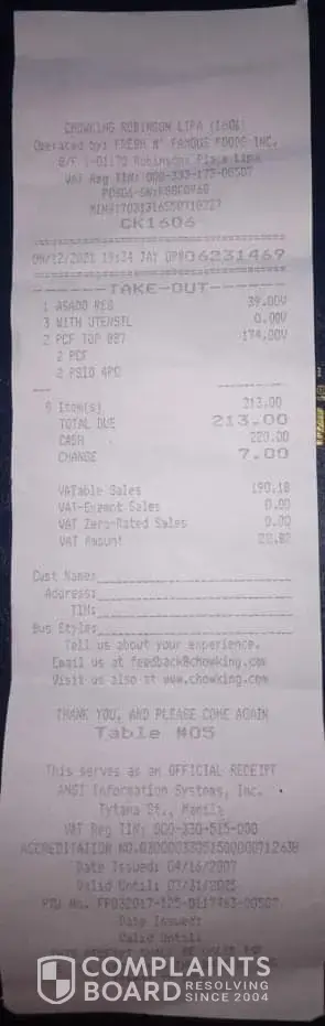 I am filing a complain to chowking robinsons lipa branch. I am writing this complaint just to remind the staff and crew of chowking! Please! Check the items or should I say don't make your customers mad at your service!
