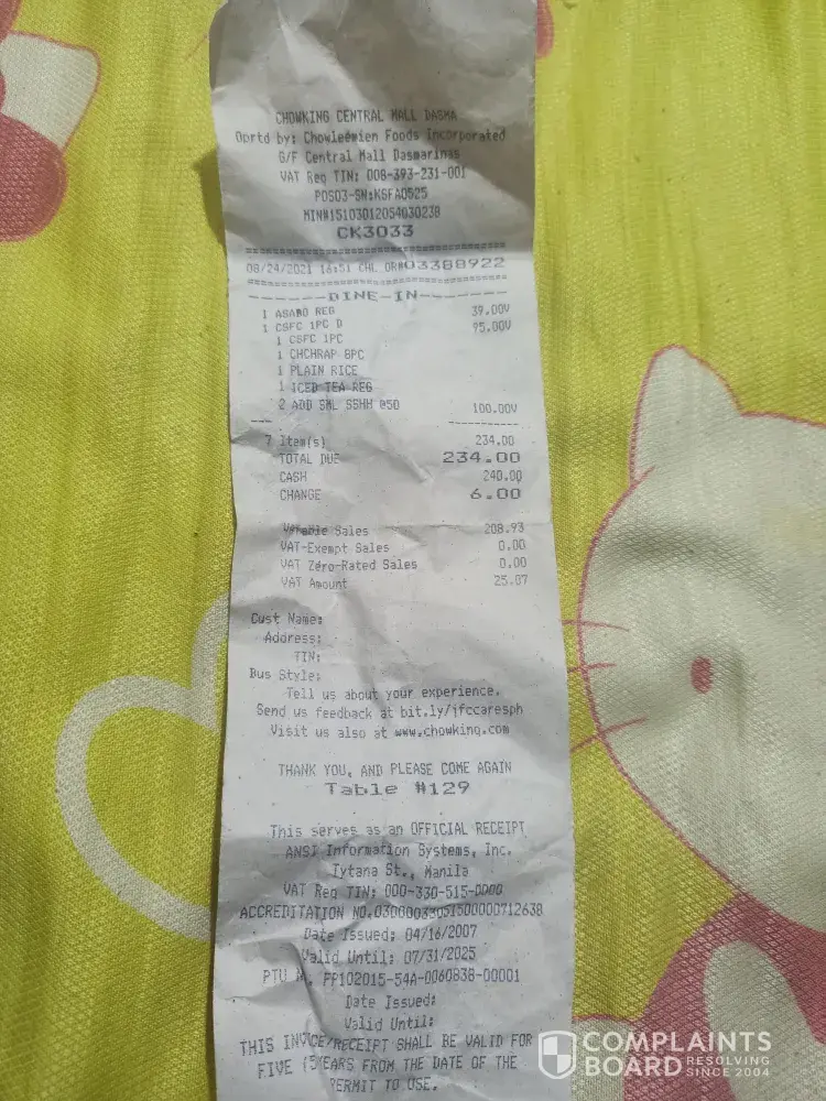 Nagcrave kami ng mga kawork ko sa chowking na malapit samin chowking anabu coastal imus kaya nag madali ako mag book via food panda okay nadeliver nman ng maayos ng delivery rider sobrang approachable din at maayos kausap, in the story short break time na namin 12:30 medyo disappointed lang ako dahil malata yung young chowpan shanghai at beef chowpan steam shomai ma's lalong ng pasama ng loob ko yung 1pcs chicken na order ko PLAIN RICE na dapat egg rice dahil ng pa upgrade ako tapos wala man lang toyomansi pano yung steam soimai?