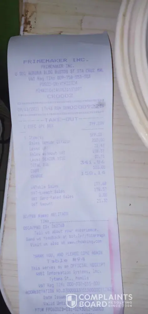 nagorder kami sa chowking pacita thru foodpanda, nagrequest kami for condiments (chili garlic, toyomansi, spoon and fork) walang dumating. tapos ung siopao walang sauce... ung tofu ang messy ng packaging. ndi na sana kami magccomplaint kasi napakasimpleng bagay lng naman.. pero 2nd time na kasi nanyare 'to.. ganyan ba tlga ang service? kasi sa foodpanda kami nagoorder? nakakadissapoint lang... ndi ako magccomplaint para sa kahit anu.. i just want you to be aware .. thank you...