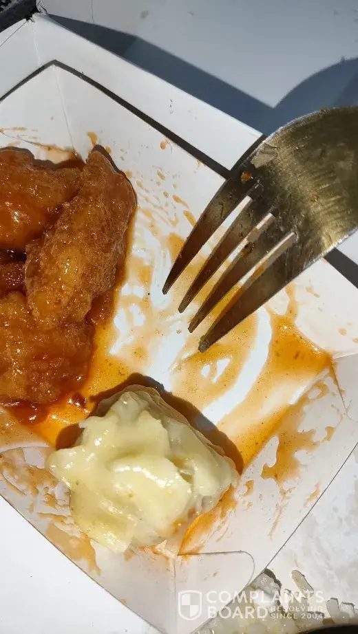 There are blue stuff together with the food. This could be poison or plastic! We only saw it when we were almost finished eating since the stuff were stuck to the cardboard box!