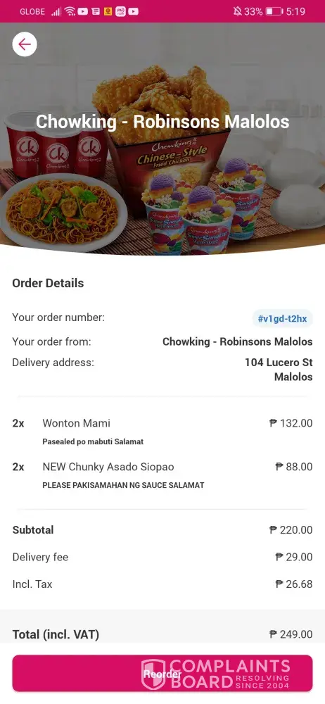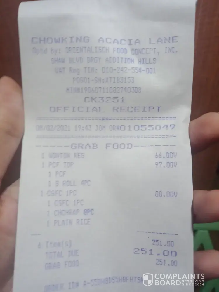 Bumili ako chaofan sa chowking Rob. Palapala July [protected]@0640 pm, nkauwi ako 0750 pm paguwi ko agad nming kakainin ung chaofan. Tpos sbi ng asawa ko pgsalin sa plato prang panid dhil mlgkit at pawis dhil pag nabili ako chaofan pagsinalin s Plato buhaghag. Sabi ko Hindi naman tpos binuklat nmin at may laway na dikit n ung kanin kya dna kinain. Kya ayun pkain nlng sa aso.