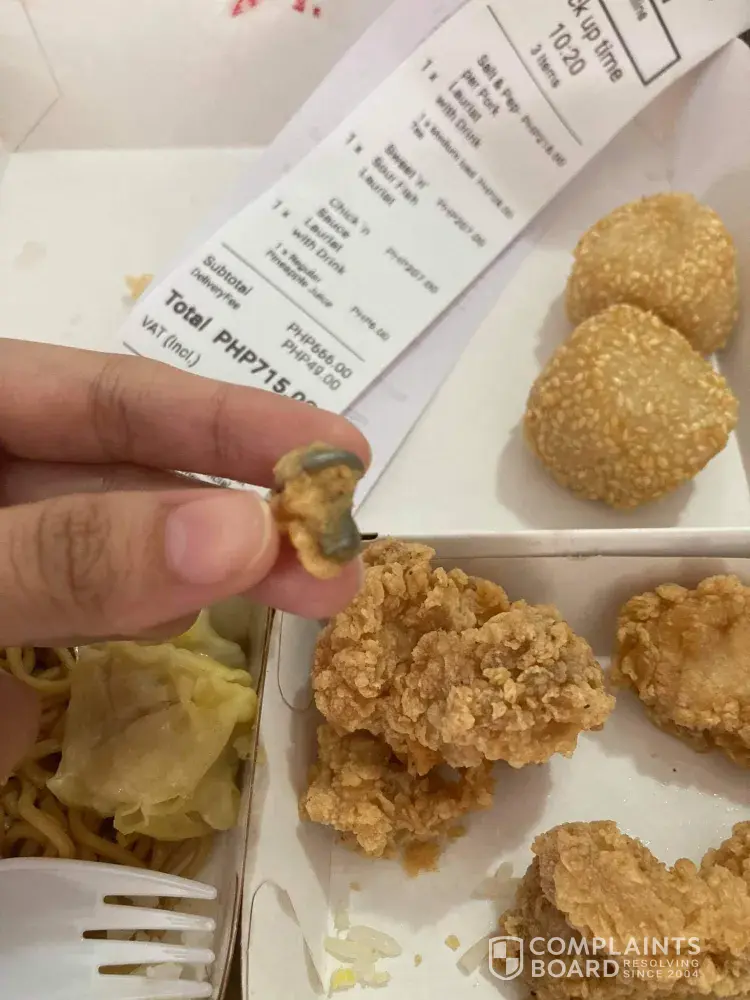 Meron pong screw yung manok ninyo! May halo siyang breeding kaya hindi gaano kahalata! Muntikan ko na po makain kanina! Bakit naman po ganun? Paano kung gutom na gutom ako at hindi namalayan? Paano po kung sa bata ito napunta? Edi baka nalunok na? Siyempre pagkain po itong services ninyo kaya isang kagat lang nasa stomach na namin ang luto ninyo and puwede ito makaapekto sa health! Hindi po ako papayag nang ganito! Ayokong maulit! Sana po mabigyan ng lesson ang mismong branch nito! Hindie ko pa po inaaupload sa fb itong picture, dahil ayoko pong masiraan ang company ninyo😠dahil mahal na mahal ko talaga ang chowking kaya nga mismong birthday ng ate ko ay ito ang pina-order ko. Pero malaking dissapointment po ang nangyari. Sana po mabigyan kaagad ng aksyon.