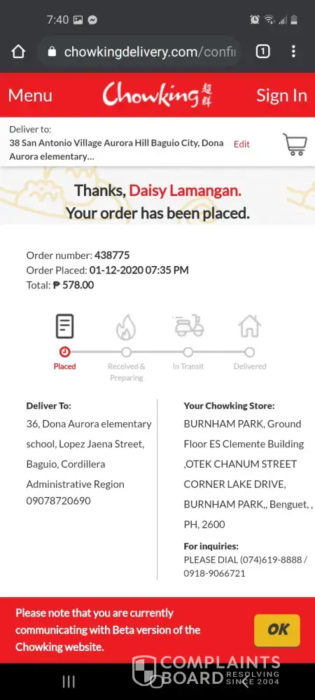 Chowking I am complaining about the service
