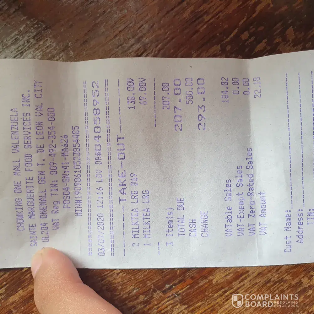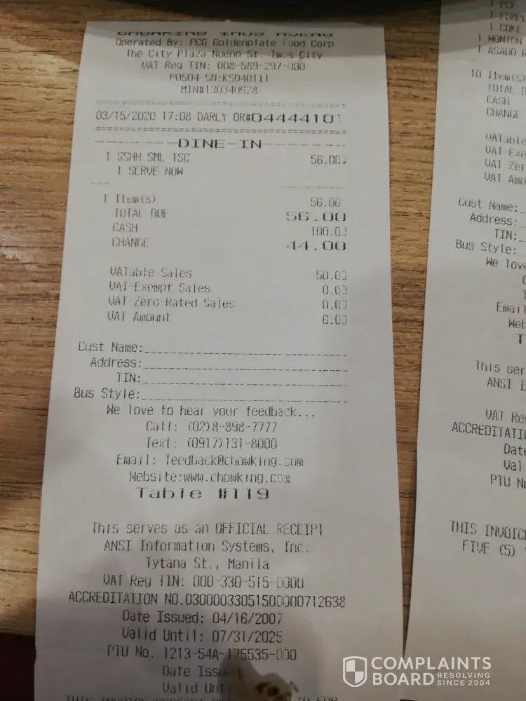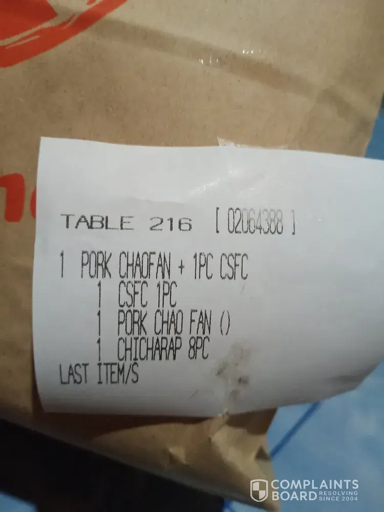 I called the grab driver and he was helpful to go back to chowking however the person i spoke in that branch keep on insisting for the receipt which I told a couple of time that was already thrown in the garbage.