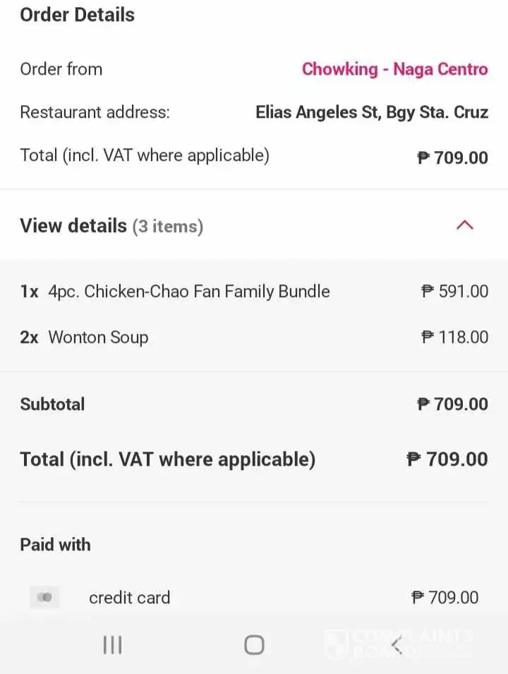 order was online, pick up transaction.. still ive waited 30 mins. for a wrong transaction upon pick up.. it was a wrong order that they serve..and just return again to the casher to tell them it was a wrong . as i went to the place to where we gonna eat the order. my heart broke.. no spoon and fork.. the soup was cold. no chilli oil and it just a gravy..i'am very unsatisfied or unhappy with the service at Chowking Elias Angeles. Naga City Branch
