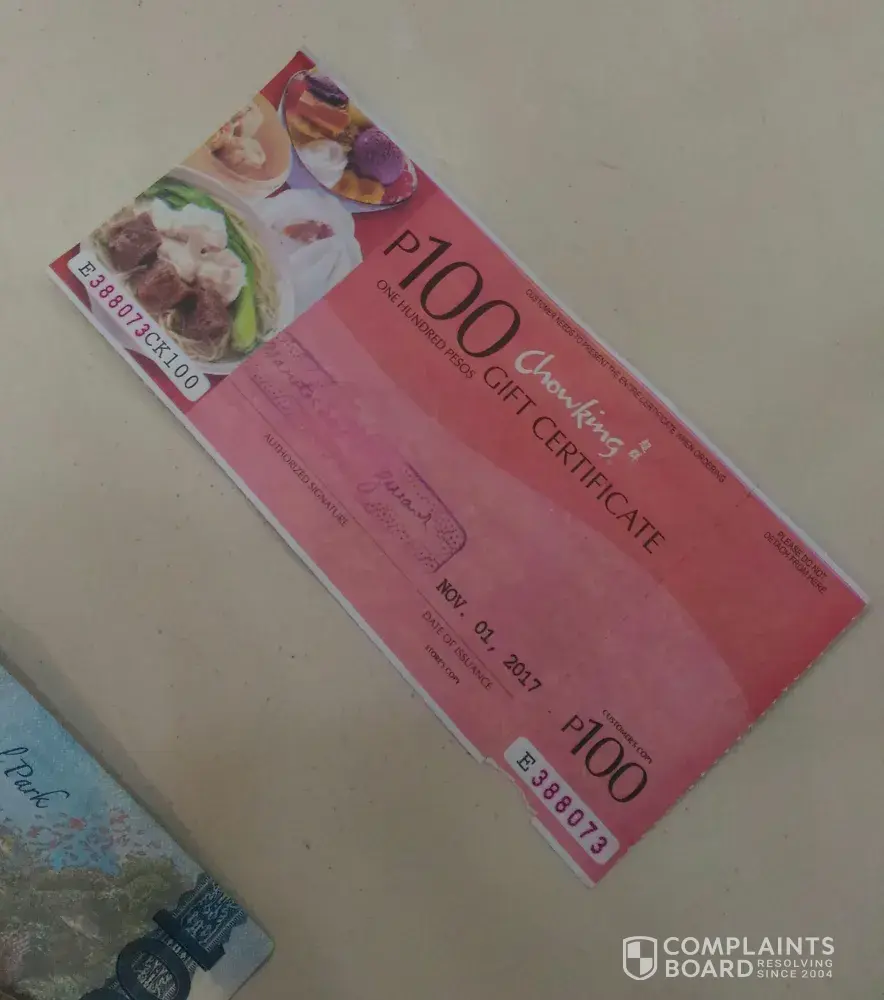 I was at the Chowking Balanga today 9/24/2018 around 4pm.I ordered a box of siopao and a halohalo.I used my gc to pay.The cashier validate it to the manager and they rejected it saying its a little bit bent and theres a small cut along the perforation line about 2cm long and 2mm wide.Emerson de Guzman and Grace Yumol-the managers said it should be perfectly cut and crisp for the documentation they were saying.I was so embarassed because Im in front of the line and a lot of people behind me hearing all this.
