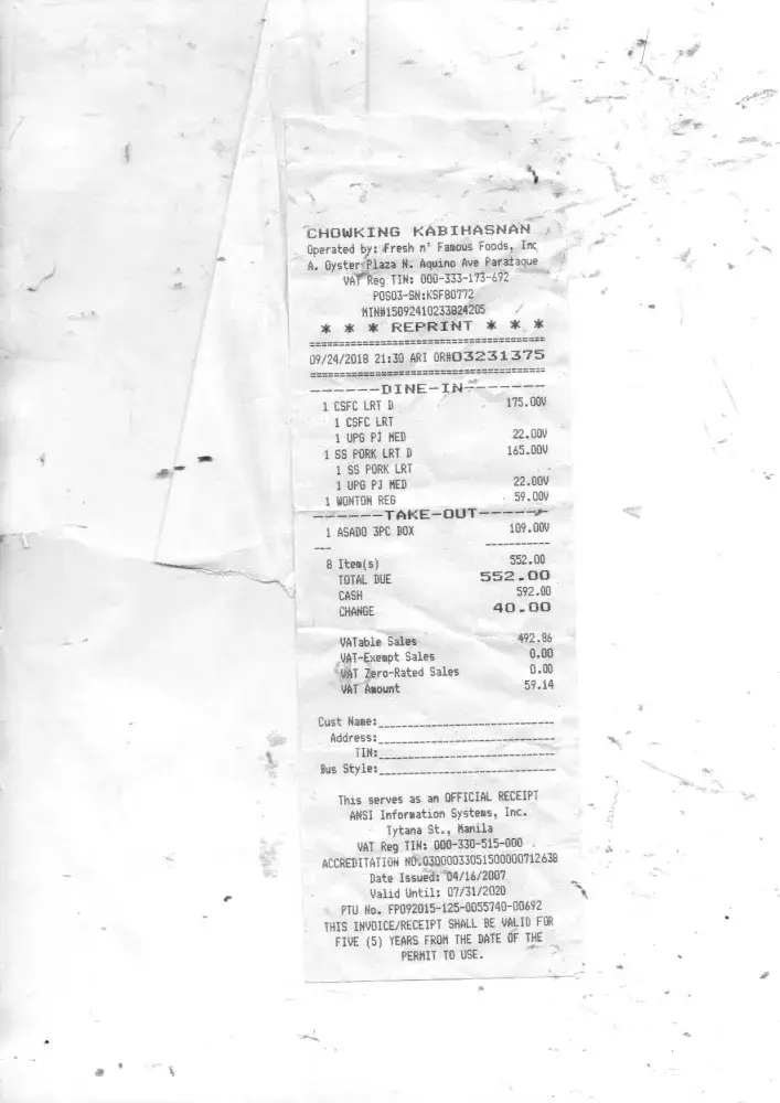 Lastly, I ask the cashier to hand my receipt before we start to eat but still I got it when we were finished and about to leave the establishment. I insisted to have since I really want to send you this letter.