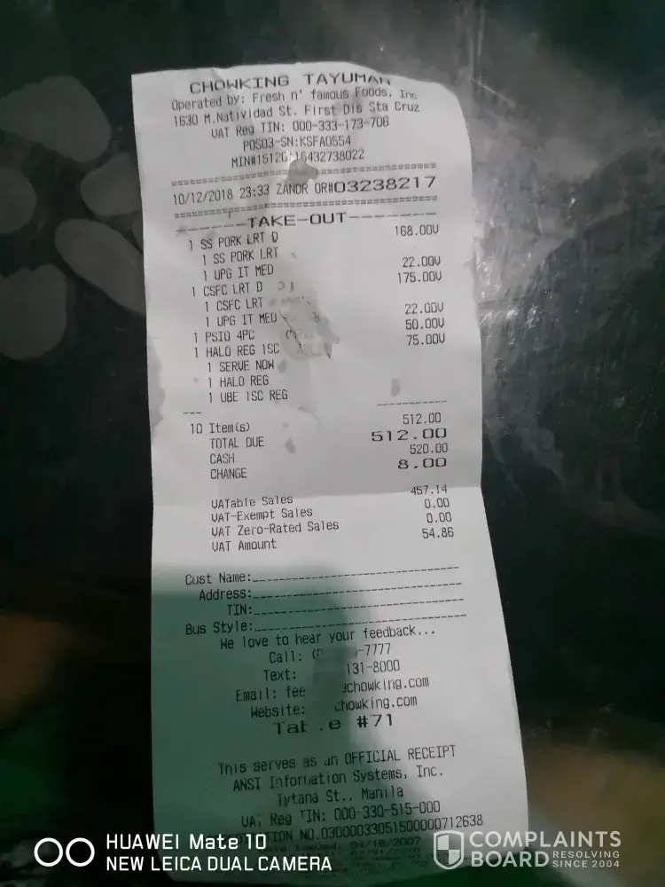 Good morning! Nakakadisappoint yung product niyo. Nag order yung husband ko ng pork chaofan with steamed siomai at 1pc chicken ngayong gabi (October 6, 2018 Around 11:30-11:45pm) WALA PANG BINIGAY NA RESIBO. ANO BA NAMAN YAN! Yung siomai niyo parang nababad na kakalublob sa noodles station tsaka nilagay sa steamer. Nagmemelt na siya sa bibig. Yung order namen na chicken walang kasamang chicharap! Yun pa naman yung hinahanap ko. Tapos yung gravy wala pa sa kalahati. Ano ba naman yan? Lagi pa naman akong nakain jan tas ganyan service niyo. Paki improve naman please!