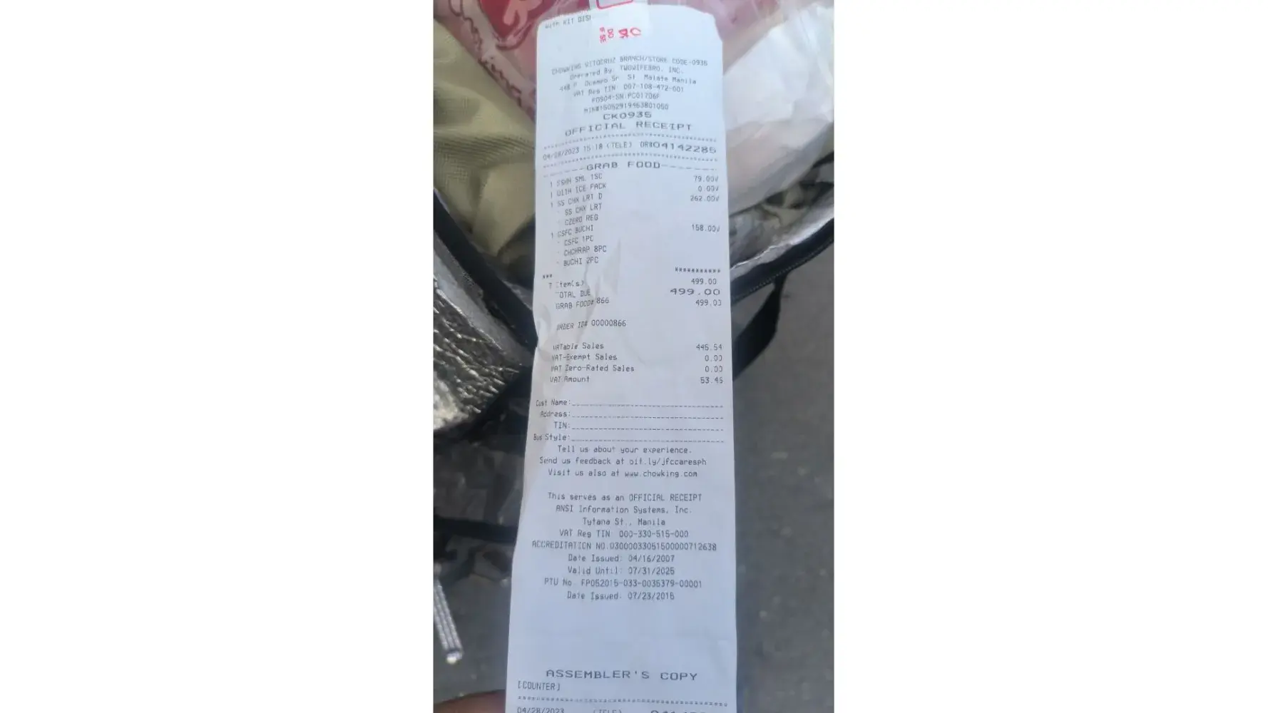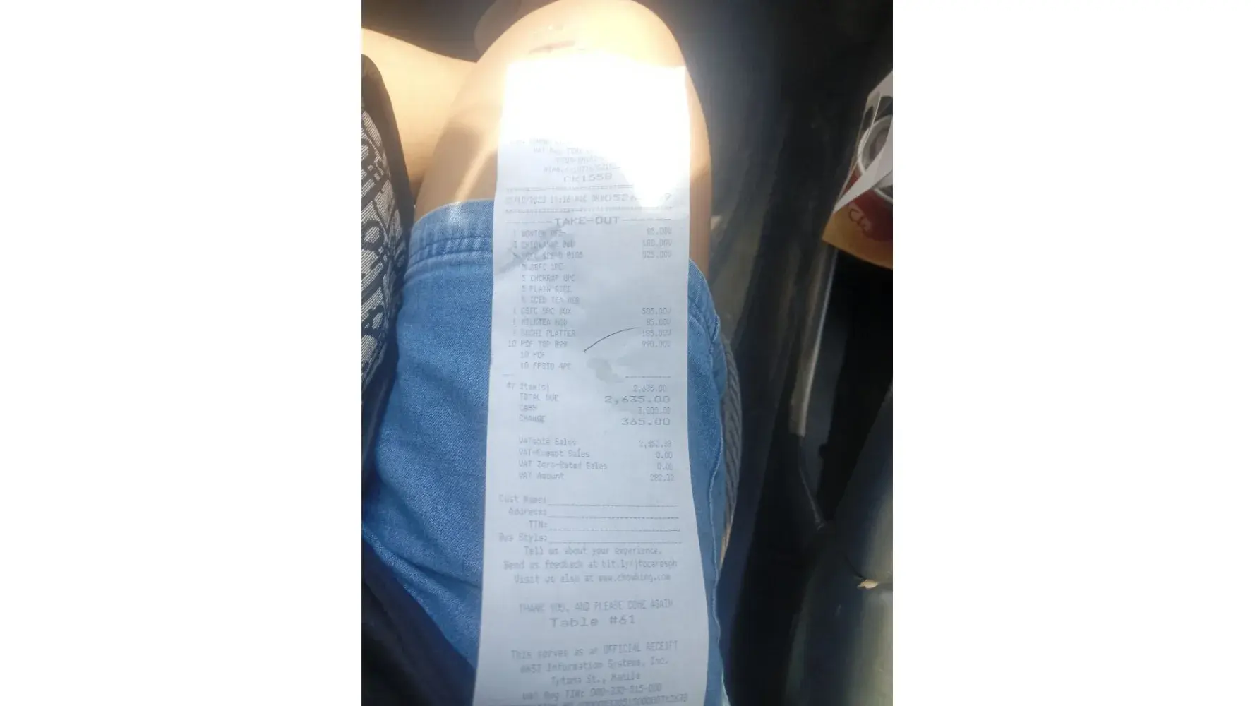 Inask ko ulit siya. Sabi ko na discount ba yung sa kapatid ko. Inulit ko ang order. Yung chicken lauriat and then tumango siya saying opo. Binigay niya lang sakin is yung confirmation receipt from cashless payment nyo.