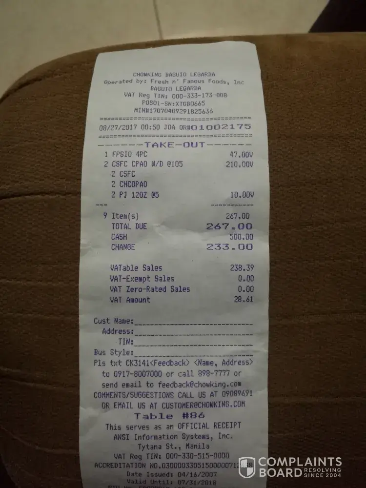 CK3141 Hi! I just ordered 4 pcs of pork siomai AWHILE AGO but i didn't get this order and I just arrived home now. Can you do something about this please? Thank you. Looking forward for your response. Asap. Raizza Cunanan of #34 Pucay Village Marcos Hiway Baguio City and oh by the way, the lady who's assigned in the counter named JOA based on the receipt is a bit irate and displeasing. and i find it annoying as a customer. The OR # is [protected], TABLE #86