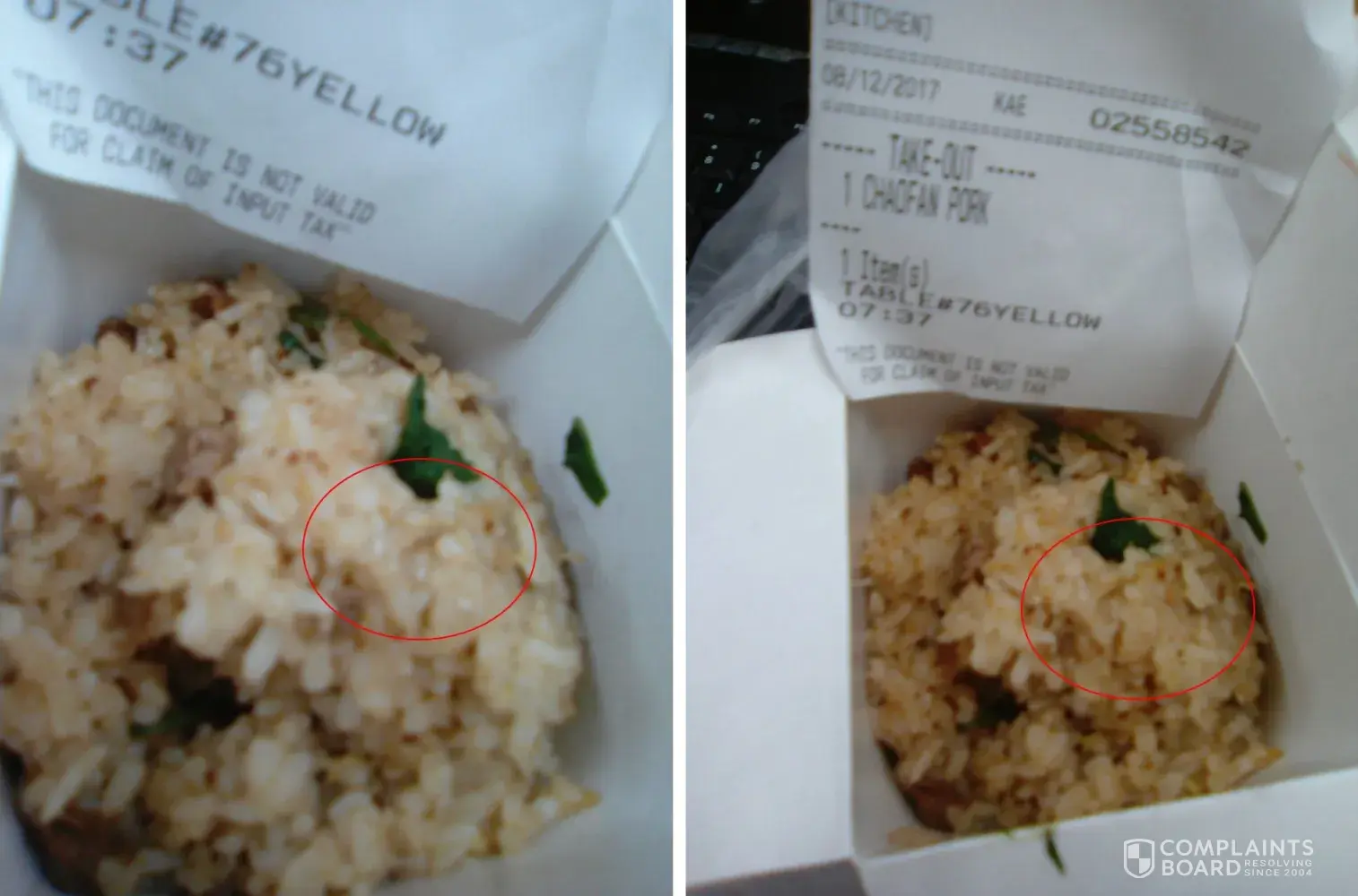 Picture is attached for pubic hair in pork chao fan, right on top of the rice when you open the box. This could not be inadvertently done because it's as if it is a garnish!