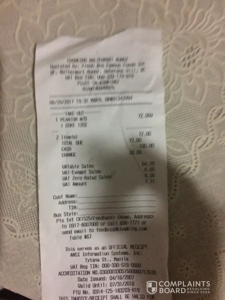 We know that we have the right to demand for a receipt. This is a responsiblity of all business. But we were so concerned of the time so we let the counter be. Pero my boyfriend saw a bunch of receipts in front of her POS and he said that it could be our receipt. The counter said they are not and they are accounting copies. My boyfriend borrowed the receipt as we were really looking for a number to call for this complaint. He was only able to get the name Fresh N' Famous. Anyway, we are very curious as to why this counter behaved very suspiciously. We did not have anythng against any other crew but her. We don't have any photo as my phone's battery was dead during that time and the counter won't give us a receipt even after demanding for one. At any rate, I am very confident that all transactions are recorded via your CCTVs so I'm sure that you will see what happened.