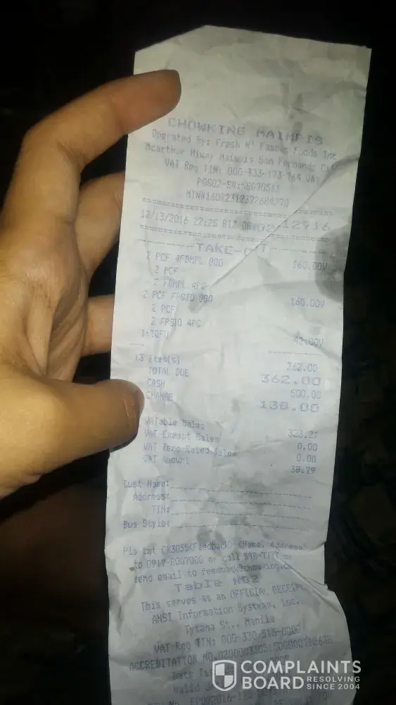 I don't usually post in social media the happenings or events in my life but yesterday was totally unacceptable. We went to Chowking It Park - since my friends are planning to celebrate birthdays outside the country... everyone was so happy. I ordered my food, nobody is next to me i paid 1000 bill and ordered beef chowfan and milky white worth 165. i was looking for spoon and fork and straw... the cashier placed my drink and number on the tray and my receipt. i was told it will be to follow... since we are very happy... i placed my things on the table and stayed at the place more than an hour. I went to my husband's workplace after we ate and went to emall to have my phone fix. Upon checking my bag putting all the things outside my bag i was nervous because i did'nt get my change. for the 1k bill. my husband and I went to it park again. we talked to the manager named Anna and asked abt Cctv and she said she will review it... UNFORTUNATELY THE CCTV WAS ONLY FACING ENTRANCE AND DINING AREA. CASHIER JUST GAVE THE EXACT AMOUNT OF THE MONEY TO THE MANAGER.