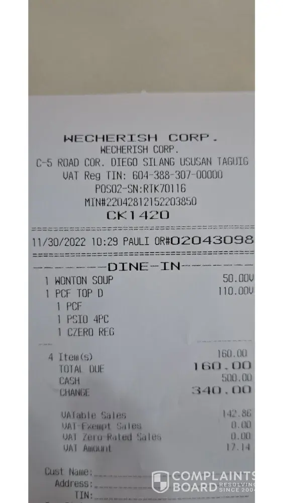 Desired outcome: I would like to have atleast an compensation for this inconvinience because this is a complete mess and also i was a chowking customer for almost 10 years however this experience is [censored].