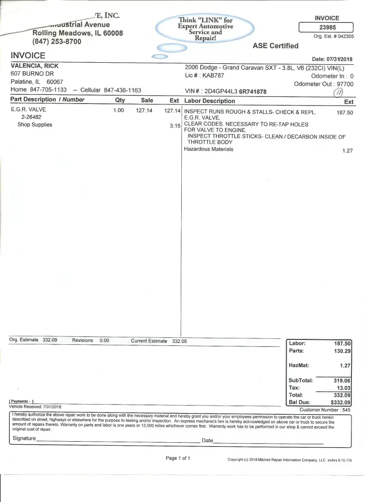 3) On 7/31/2018 at 97, 700 miles. He placed it with NAPA EGR part # 2-2482 $332