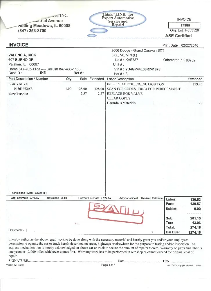 My mechanic brought up the fact that he sees a lot of these MOPAR EGR valves fail and questions why Chrysler has not issued a recall on this matter. As matter of fact, the EGR valve had to be replaced twice before on this same minivan: