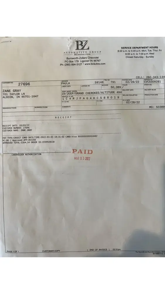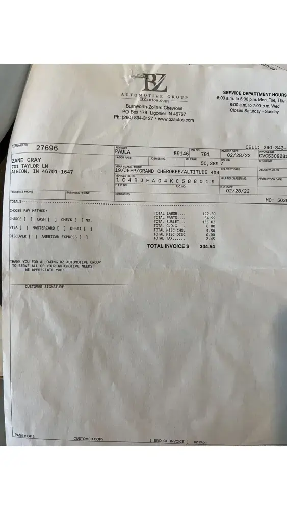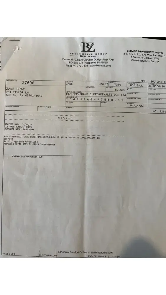 Service work done at mc kinney dodge chrysler jeep mazda, in easley, s.C. C.