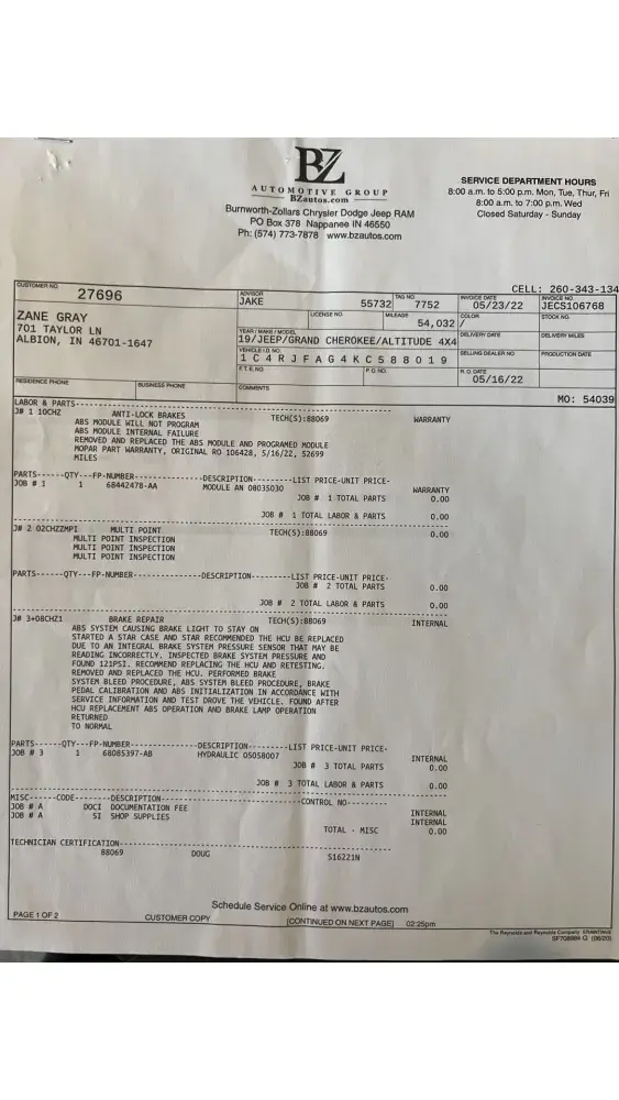 I'm not one to usually complain. I don't write bad reviews, but I think Chrysler should be aware of this. I'm in the Air National Guard, I work hard for my money (as I know all honest people do), I sacrifice a lot of time away from my family and for our country and when I pay for something that I feel I shouldn't have, I get a little frustrated. My husband and I will never by a Chrysler product again because of this journey. My 2019 Jeep Grand Cherokee was in the shop three times for the same issue: my brake lights would stay on and you could start my jeep without pushing on the brake pedal. Being a mother of two young boys, this is a huge safety issue for me. On 28 February 2022, the dealership replaced the brake switch and reprogrammed the brake switch - $304.54. That didn't fix the issue, same thing would happen, my brake lights would stay on and you could start the jeep without pushing on the brake pedal. 16 May 2022, the dealership traced all wires and found internal issue in module (They had my vehicle for a week!) Replaced ABS module - $673.61. Issue was still not fixed. 23 May 22, dealership removed and replaced ABS module and programed module (warranty). ABS causing brake light to stay on, dealership started a star case and star recommended the HCU be replaced due to an integral brake system pressure sensor that may be reading incorrectly. They did this and it fixed the issue. They had my Jeep for another week and didn't charge us for the fix because they felt so bad. Later Z48/NHTSA 22V-426 recall was issued (I think my case is one of the reasons it was issued)! Guess what the recall is for - an HCU/ABS module that falsely reads pressure which causes the brake lights to illuminate as well as allows the vehicle to start and shift out of park without the brake pedal being depressed. We paid $978.15 for something that was covered under the Z48 recall and when I submitted a case on www.fcarecallreimbursement.com it was denied. Very unhappy customer. Thank you for listening to my story.