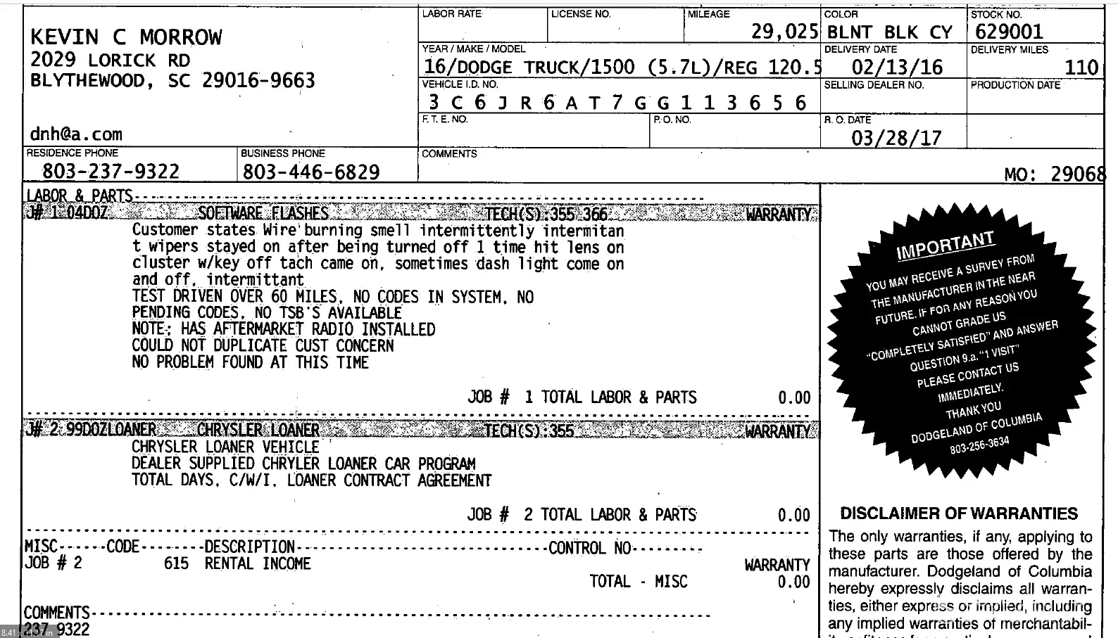 I purchased a brand new 2016 Dodge Ram 1500 truck and have had electrical issues from the 3rd day I bought it till now. I paid $31,000 for a truck and three days later I was at Dodge Land of Columbia SC explaining the strong burning wires smell. They wanted to keep the truck for a few days to go over it, I said of course. Well I was upset as they didn’t even want to give me a loaner car, how professional is that. They kept the truck a few days and told me they couldn’t find anything. I took it back multiple times and made multiple phone calls to them and yet nothing ever got resolved. Attached are some of the work orders I got from Dodge Land in SC. I know there is an electrical problem, here are some of the things that have been happening.