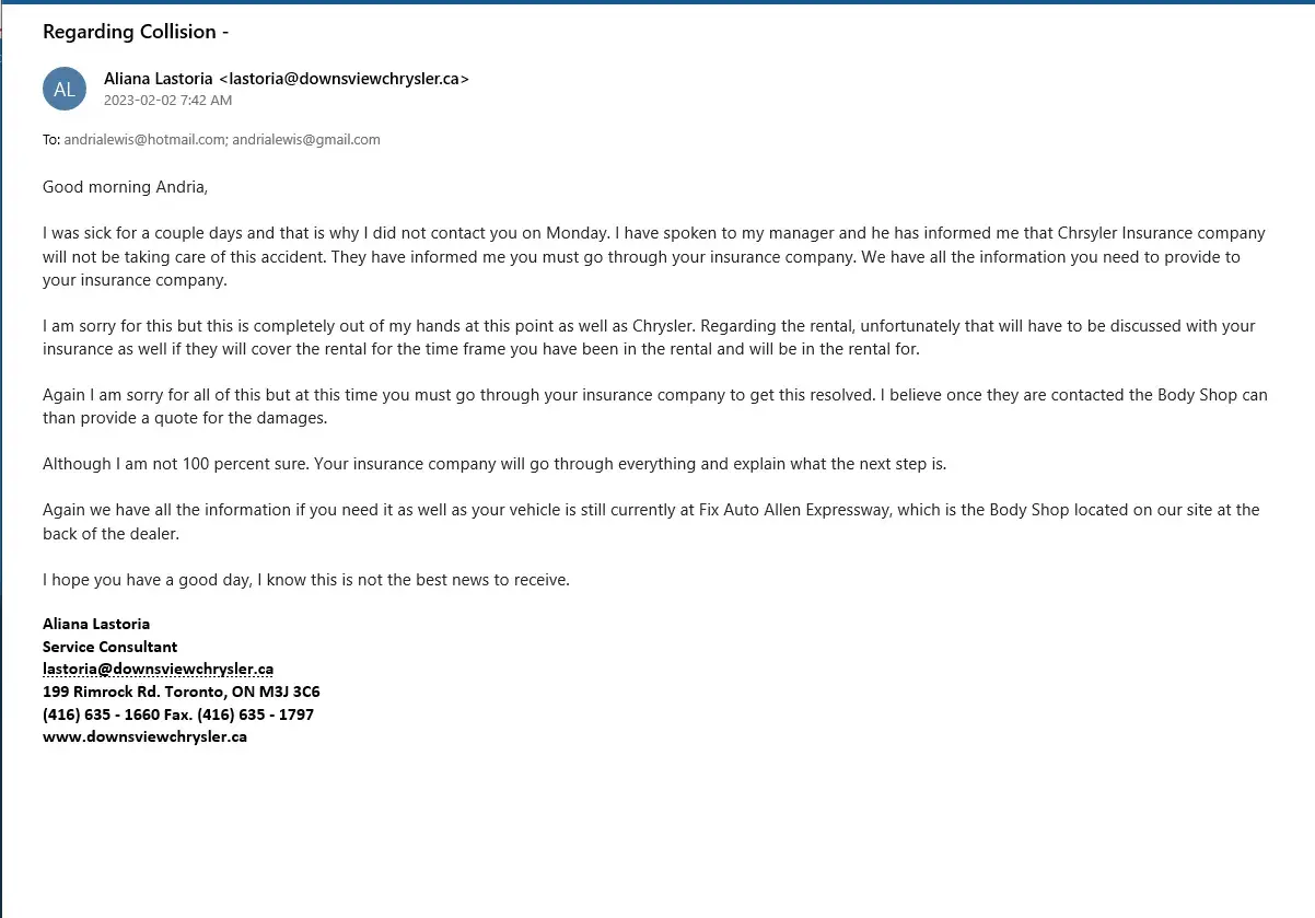 I also received a letter from Downsview Chrysler cc'd to their Barrister advising that my vehicle should be removed from their property or it would be ticketed and towed by the City of Toronto and retrieval will be at my expense even though I were not aware of all the events that happened before the accident was brought to my attention.