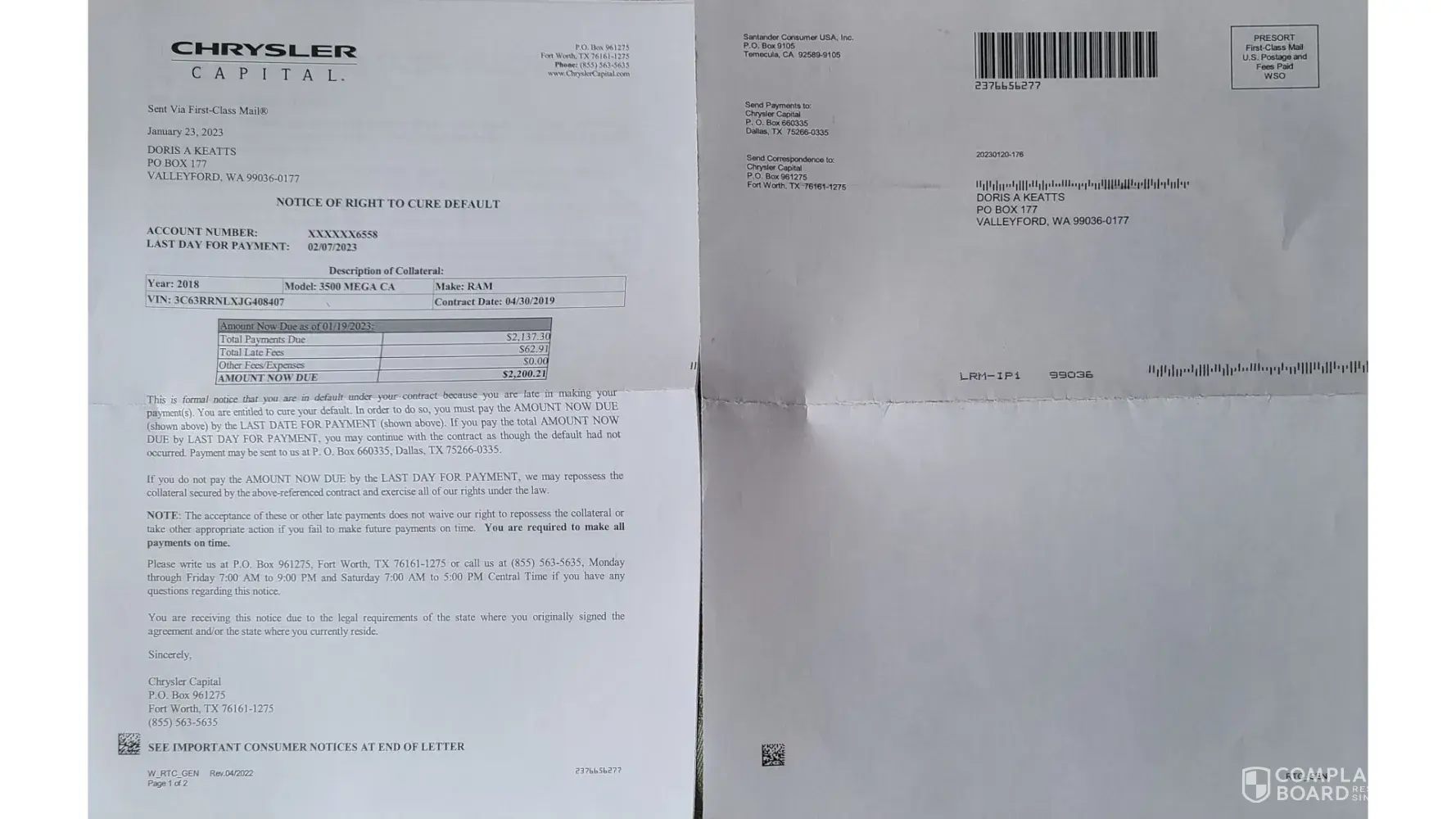 Chrysler Capital Payments and mail negligence