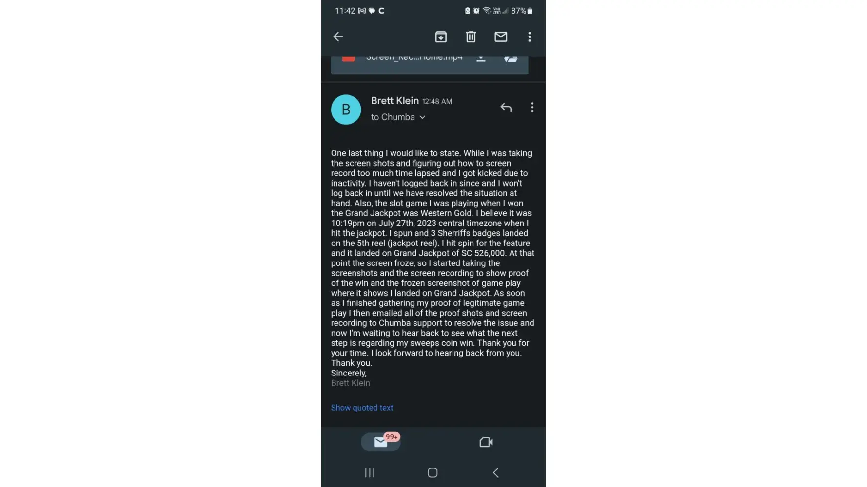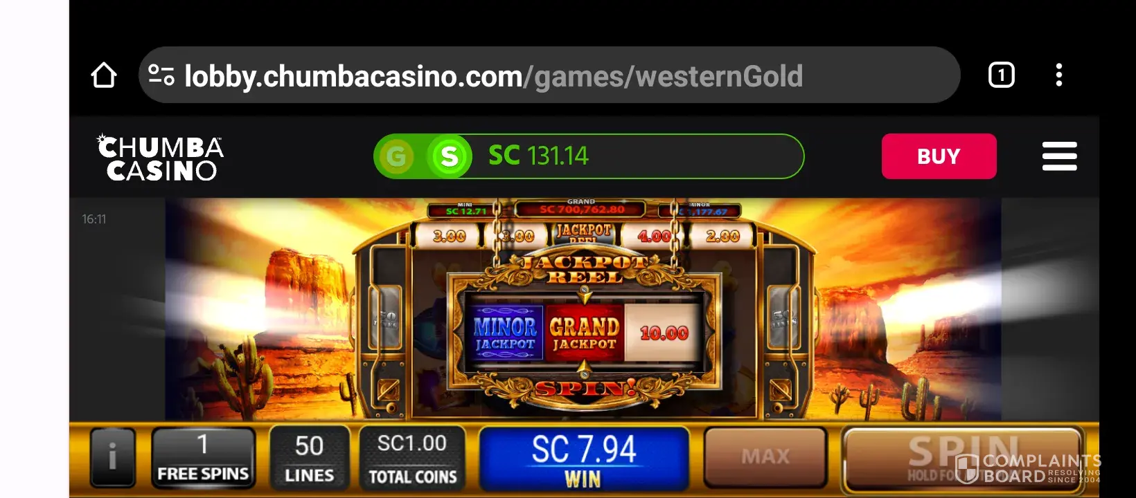 I was playing on Chumba Casino and hit the Grand Jackpot on the game Western Gold. They are refusing to acknowledge the win and trying to alter my game play history as well. I only spun one time and won a Grand Jackpot when all of the sudden the screen froze. I have screen shots and screen recording of it that I will attach showing I landed on the Grand Jackpot. I will also show the game play history they have altered and trying to say it was only a $2.91 win.