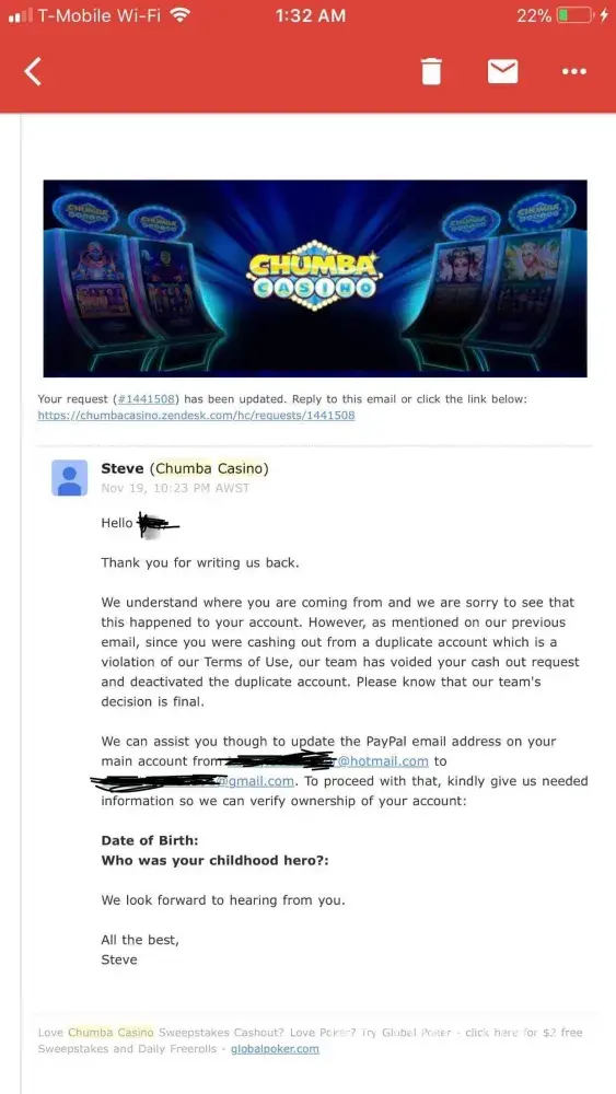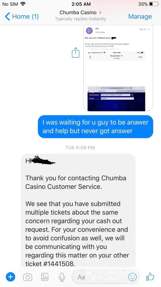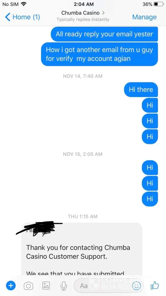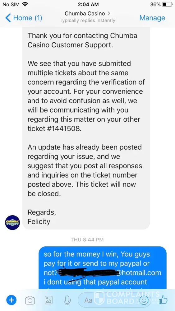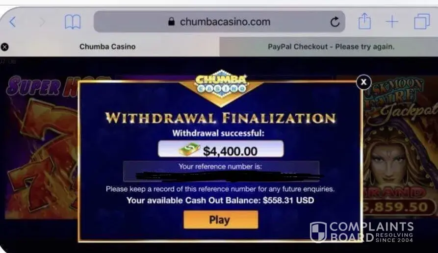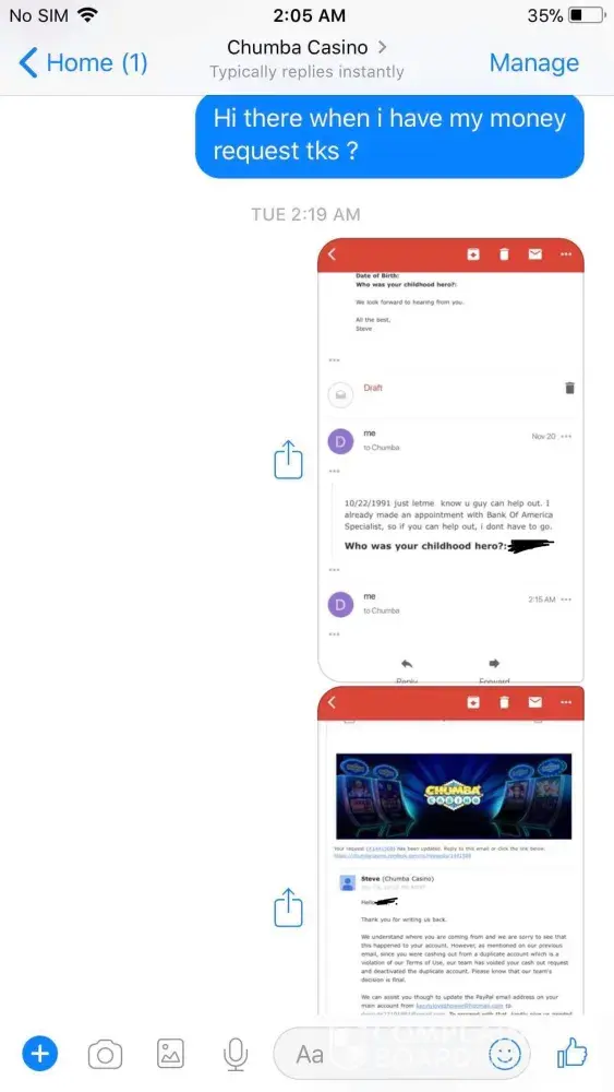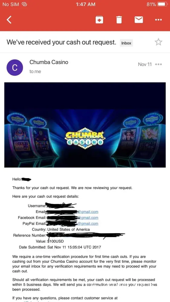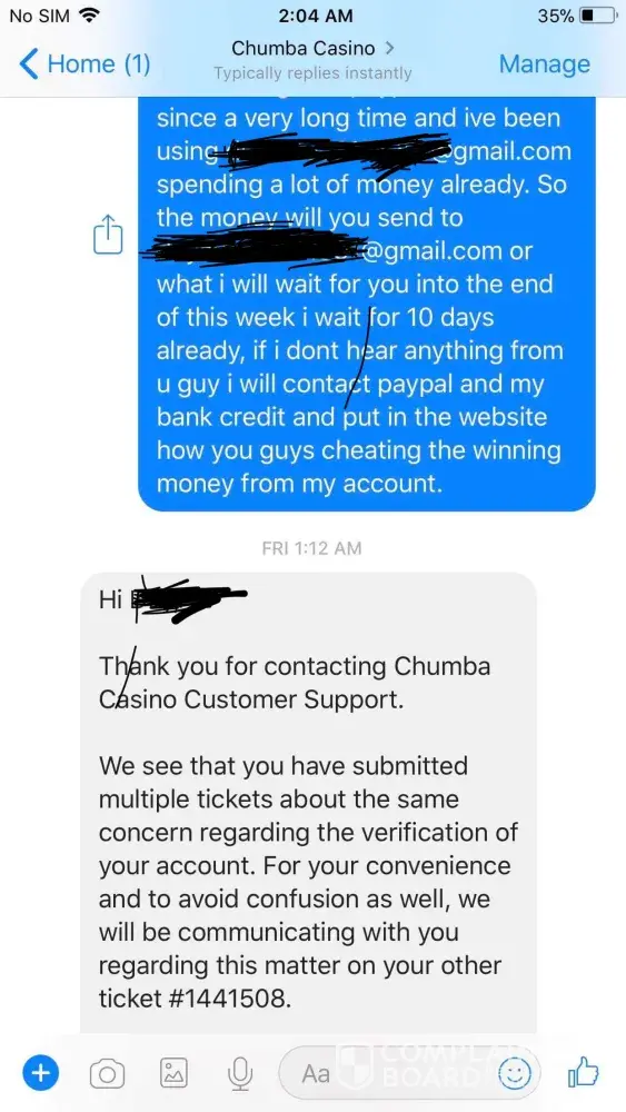 Chumba casino asked for my information, and I complied. A few days went by with no feed back from chumba casino. So I began emailing them with no response. I made all my deposits threw paypal. So I went to paypal and asked for a back pay or stop pay to chumba casino's. I did this with every deposit I made. I instantly got a email from chumba. They finely...