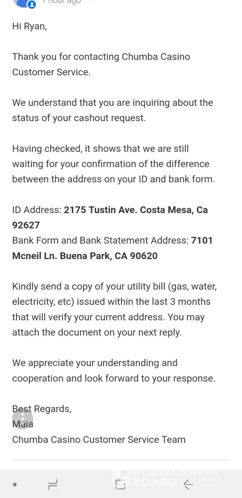 I have recently played with chumba casino and had the ability to cash out at least $900. Every since then they have given me the run around and will not cash out my winnings. It first started because of incorrect banking information. Which I provided them 2 separate accounts with the accurate information . I provided all of it to them at least 4 times. Now because on one area of the accounts that I gave them did not update my name appropriately from 7 years ago they are now requesting that I provided them a copy of my marriage licenses utility bill and a whole bunch of other stuff before they will give me my winnings. Please help