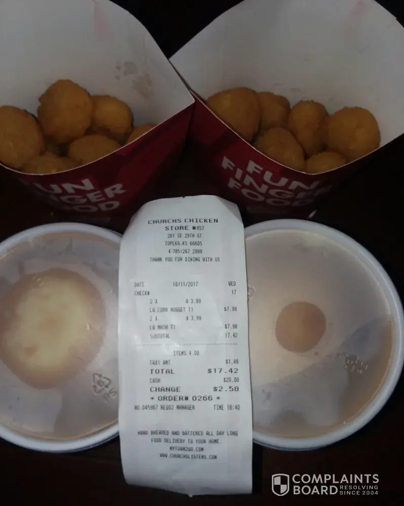 Well I went to churches earlier to get some sides to go with dinner, I paid almost $18.00 And I got 2 small containers of mashed potatoes (supposed to be the largest size) and 2 of the largest orders of corn nuggets (they were barely half full) now I'm home across town, with my kids, father, and family all seated at the table and there isn't even enough for everyone and I can't get back out of the house tonight. I'm so disappointed, I love churches chicken but it seems like they have not once had a good crew at that store. And now dinner is messed up
