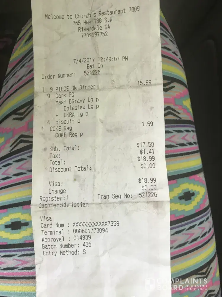 0n 06/17/2017 I went through the drive thru at Churchs #1435 and received the worst tasting chicken. It doesn't even seem like Oklahoma City, OK is using the same original recipe for Churchs. The chicken was not golden brown it was dark brown. The skin or the breading was too hard to even chew. it was just plain horrible. I had stopped going to Churchs here in OKC because the chicken just doesn't taste the same. but yesterday put the icing on the cake. The chicken was not fresh. I understand being individually owned but if the Churchs Chicken logo is being used, the Chicken recipe should be Churchs original recipe and not what this Churchs is selling. I also would like my $20.58 refunded.