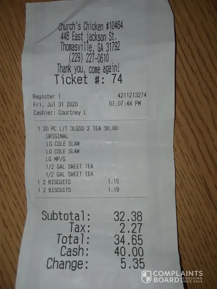 Churches Chicken #10341 101 S. Prairie Street, Union Springs, AL 36089 [protected] Date of Incident 1/31/2021 2:48 pm, station #1 check #100060. management: rachardonnay My self and my husband arrived at the store and I ordered the 20.00 special mixed, 2 large side ($22.00) total at the drive through. I was told by cashier that it would be 15 minute...